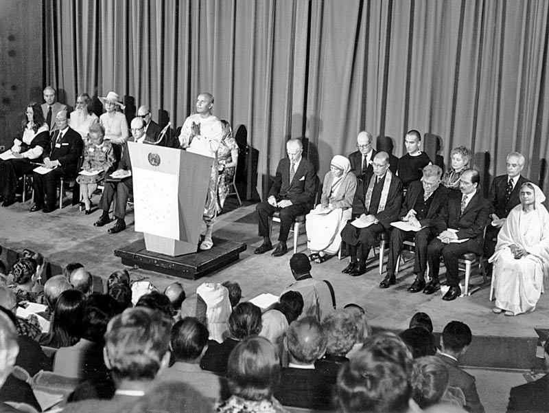 On October 24th, 1975, Sri Chinmoy met Mother Teresa for the first time at the United Nations Headquarters in New York. It was the first international interfaith conference at the United Nations. Sri Chinmoy offered the opening silent prayer for world peace, and Mother Teresa spoke on God's Love. Mother Teresa asked members of all faiths to serve the poor and suffering as members of one family under one loving God.