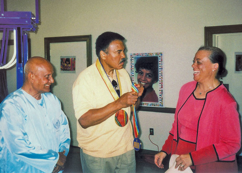 On 12 June, 2003, Sri Chinmoy honoured Muhammad Ali and his wife Lonnie with the “Lifting Up the World with a Oneness-Heart” Award, at a program held in the Oneness-Family School in Chevy Chase, Maryland, where Sri Chinmoy literally lifted the recipients overhead on a ceremonial platform. This was part of a unique award program offered by Sri Chinmoy to recognize individuals from all walks of life who had inspired and uplifted humanity.