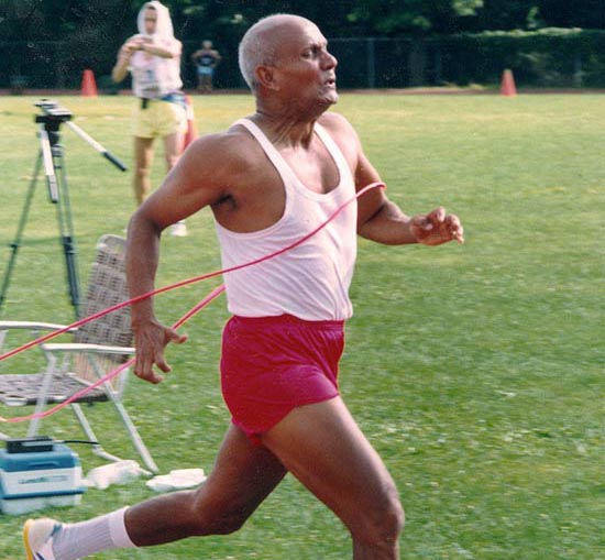 Where injuries allowed he continued to participate in athletic meetings into his 60s and 70s. He participated in the World Masters Games in San Juan, 1983, where he ran the 400-metres in 72.66 seconds. In 1983 (at age 52), he ran the 400-metre dash in 72.66 seconds at the World Masters Games in San Juan, Puerto Rico. At age 49, he ran the 47-mile Sri Chinmoy Ultramarathon in 11:27:24 in Queens, New York. An important part of Sri Chinmoy’s philosophy was to transcend the barriers of age.
